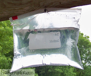 Well, instead, I found some kind of “As Seen on TV!!” fly trap. It was cheap, so I bought it. And then I remembered that plastic baggie thing. So we’re going to try a little experiment. We’re going to hang BOTH of these devices separately, and see how they do. And I’ll let you know the results. 😀