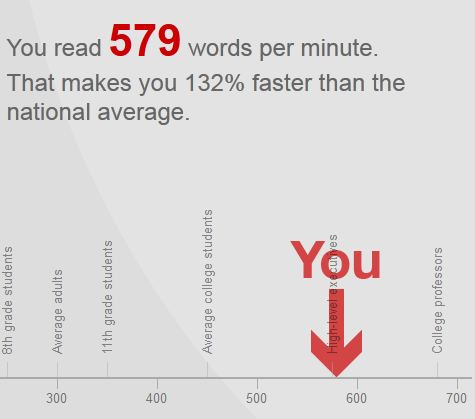 I found an interesting test (thanks for the link, Karen!) that tests how quickly you read AND comprehend. I think it’s a pretty cool test. Here are my results: