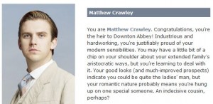 I found a cute Internet quiz called What Downton Abbey Character Are You? I’ve always like Masterpiece Theatre (it’s called “Masterpiece” now). Since I downloaded the PBS app for the iPad I have been riveted to one of their series, Downton Abbey. I’m a big sucker for British history (I study it in my spare time) and so obviously I am nuts about this series. I loved Season 1, as it really blended the historic period (sinking of the Titantic, the Gilded Age, etc) so well with typical British aristocracy (the lords and ladies, castles, entails, etc). Season 2 has become more of a soap opera and there have been a few lewd scenes in it, so the luster has cooled a bit. Still, I love the general history and I LOVE that castle! I have GOT to see Highclere Castle someday. I recently discovered that Highclere is the home of the Carnarvons! Lord Carnarvon discovered King Tut’s tomb in the 1920s- I studied that discovery thoroughly as a kid. I’ve seen a few documentaries of the castle…. oh, what a beautiful place.