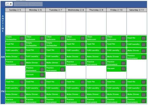 Highlights include the allowance tool, the family calendar (an ONLINE one that cannot be lost or eaten by the dogs!), and the chore tracker. The chore tracker is nice- the Boss (that’s me) creates a calendar of events (like vacuuming) and the child checks in each day for his/her assignments. He/She clicks the chore when done to mark it as done. It’s a great way to encourage the “work first, then play on the computer” habit. I made a little chore chart- what do you think? Is it too stuffed?!
